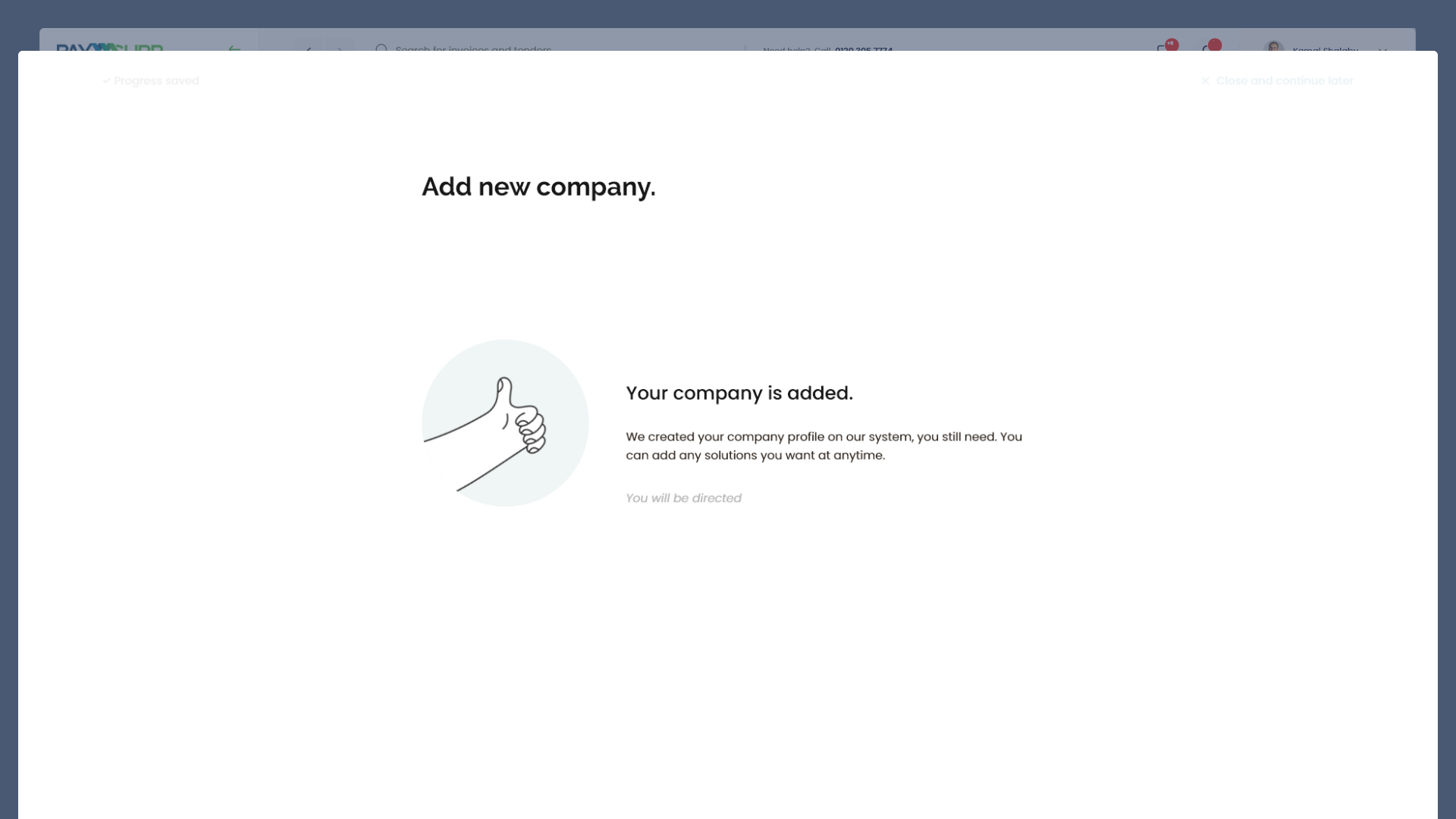 Now that our user has started an account, they still need to do a lot. They need to add their company information, choose their needed solution, go through the approval process and upload needed documents.