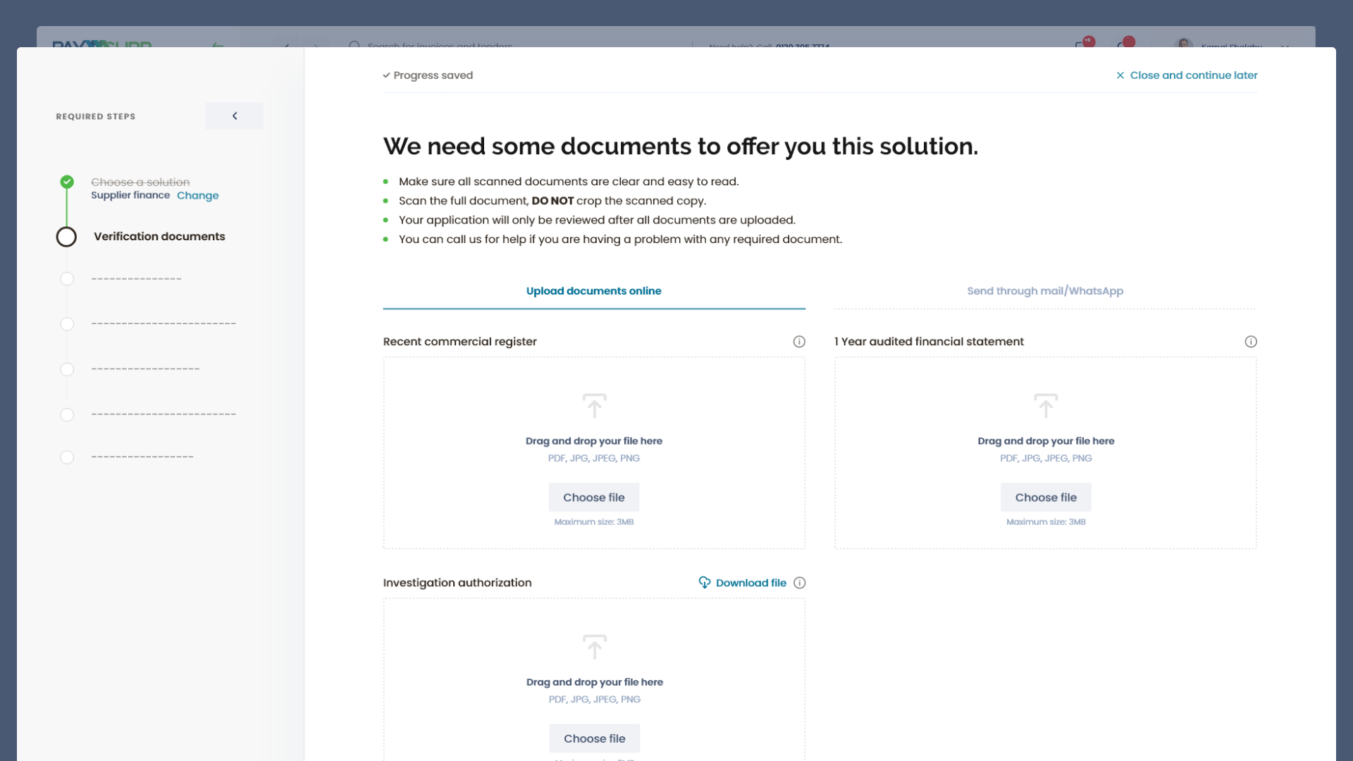 During our first phase of redesigning the onboarding process, we designed a document upload step that allowed customers to upload the required verification documents needed for the selected financial solution they are applying for.